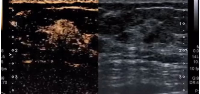 乳腺檢查新技術(shù),包括了三維超聲,超聲造影以及彈性成像技術(shù)。說到三維超聲,大家可能比較熟悉的是胎兒的三維超聲。其實這種技術(shù)也廣泛應(yīng)用在乳腺癌診斷上。乳腺癌的三維超聲圖像呈太陽光芒征,跟二維圖像對比。直觀顯示了腫瘤對周圍組織的浸潤改變,超聲造影是通過靜脈注射超聲造影劑。來增強人體的血流信號,可以實時動態(tài)地觀察組織的微血管灌注信息。提高對病變的檢測率和對病變的良性、惡性腫瘤進(jìn)行鑒別。超聲造影表現(xiàn)為不均勻增強,病灶造影測值增大。是典型的乳腺癌超聲造影表現(xiàn)。