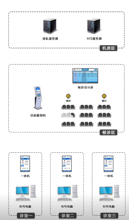 排隊叫號系統(tǒng)圖,機房區(qū)由排隊服務器和叫號服務器組成。候診區(qū)由自助報道一體機,播放喇叭候診顯示屏組成。診室區(qū)由排隊叫號顯示一體機和呼叫電腦組成,同時服務器顯示屏叫號一體機都是通過tcp聯(lián)網(wǎng)。