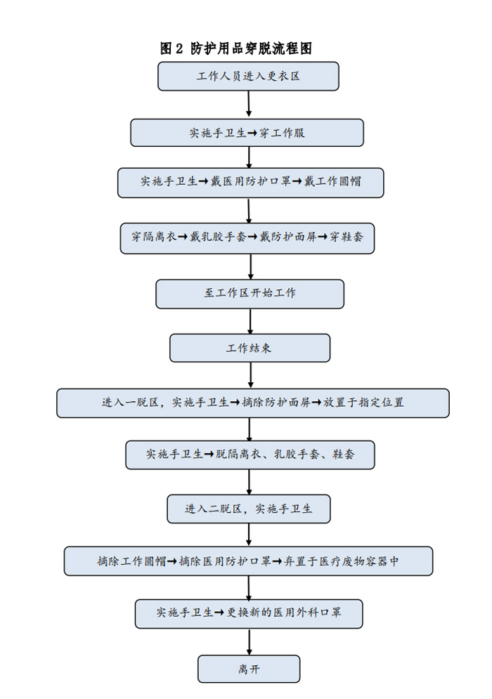 除X線電離防護(hù)外,方艙CT檢查需對操作技師、患者及家屬做相應(yīng)的防護(hù)。根據(jù)國家衛(wèi)生健康委辦公廳印發(fā)的《新型冠狀病毒肺炎防控方案》(第五版)[6]對于在新型冠狀病毒感染的肺炎疫情防控工作中不同的工作人員其防護(hù)等級是不同的。如是疑似患者,技師則執(zhí)行二級防護(hù)。方艙CT內(nèi),設(shè)置清潔區(qū)、一脫區(qū)、二脫區(qū)、免洗手消毒液、一次性防護(hù)服、一次性乳膠手套、鞋套、洗手液。技師需經(jīng)多次反復(fù)訓(xùn)練穿脫流程和檢查流程,并做好總結(jié),考察合格方可上崗。為此我科花費(fèi)了大量時間進(jìn)行了防護(hù)用品穿脫,消殺,接診流程的演練,并做總結(jié)和改進(jìn)措施。(附件1所示),防護(hù)用品穿脫流程如圖2所示。
