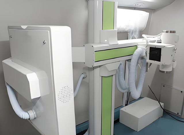 首先按下綠色的電源開關(guān)按鍵,整個車載DR設備就會通電。再按下高壓發(fā)生器的開機鍵,然后電腦主機也開機運行。打開DR工作站系統(tǒng),它開機的話有一個過程,需要幾分鐘時間,DR室門口有門開關(guān)跟當心電離輻射提醒標志。檢查室里面有按鈕可以把設備調(diào)高調(diào)低,檢查時候這個手背著臀部上一點點,反向胸部靠著DR,通過升降來調(diào)整擺位的一個狀態(tài)。還可以通過搖把來調(diào)整探測器跟球管的高度。還有線束器的一個調(diào)節(jié)。我們一般拍胸片的話,一般不用管這個操作。 一般出廠設置跳到了一個合適的范圍了??刂破脚_也是可以控制開關(guān)門,并不需要按門口的按鍵。