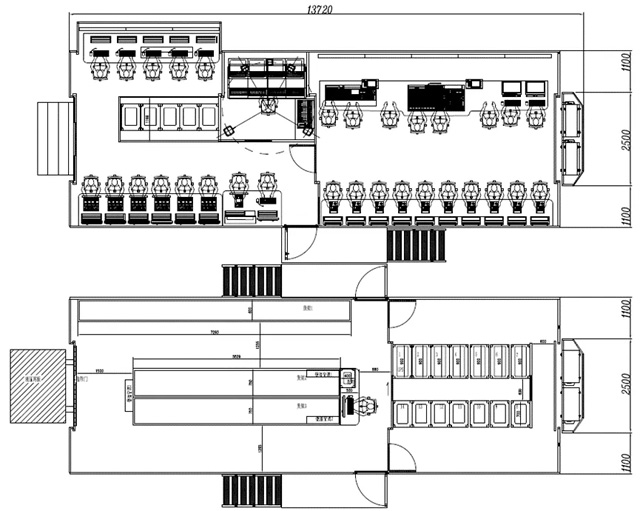 由于收車時(shí)內(nèi)套拉箱頂收回,強(qiáng)冷機(jī)柜若在拉箱區(qū),出回風(fēng)會(huì)很難設(shè)計(jì),所以通常將強(qiáng)冷柜放在不帶拉箱的部位,加上兩側(cè)拉箱總寬度不得超2.5米,這導(dǎo)致整個(gè)廂體很難做大,以下是幾種最常見(jiàn)的布局,基本都是配備4組強(qiáng)冷機(jī)柜,如果想要增加強(qiáng)冷機(jī)柜數(shù)量,就需要減小拉箱面積,這就會(huì)影響到制作區(qū)和技術(shù)區(qū)面積。無(wú)論是單外套還是雙外套,由于拉箱頂在主頂外邊,強(qiáng)冷的出回風(fēng)就比較好設(shè)計(jì),但同樣受到兩側(cè)拉箱總寬度不得超2.5米的限制,廂體也不可能做太大,可以考慮配合第三級(jí)內(nèi)套拉箱使用由于內(nèi)外套是采用上下疊加的形式,避開(kāi)了左右相加不能超2.55米的限制,所以設(shè)計(jì)起來(lái)就比較靈活,也能做得更大,強(qiáng)冷區(qū)只要避開(kāi)內(nèi)套拉箱,出回風(fēng)也比較好設(shè)計(jì)。以下是最近國(guó)內(nèi)比較常見(jiàn)的布局。