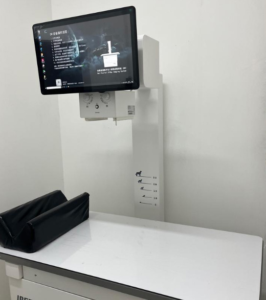 這就是寵物專用的寵物DR影像系統(tǒng),檢查設(shè)備非常重要??焖倥袛嗖∏镈R系統(tǒng)由于它成像快的優(yōu)點(diǎn),現(xiàn)在已經(jīng)在寵物醫(yī)院廣泛的使用的儀器設(shè)備。都是比較有實(shí)力的寵物醫(yī)院??梢栽趧?dòng)物動(dòng)態(tài)情況下進(jìn)行DR攝片檢查。DR的作用在臨床中拍片子,可以看有沒(méi)骨折、有沒(méi)有膀胱石,有幾個(gè)胎兒等等,DR的手術(shù)床可以活動(dòng)的方便我們中間去選位置,可以跟這個(gè)大小調(diào)整位置。鉛衣是做拍攝防護(hù)的,選擇拍攝部位,腿部、胸部、前肢等。不同部位的值也是不一樣的。千伏毫秒都不一樣。