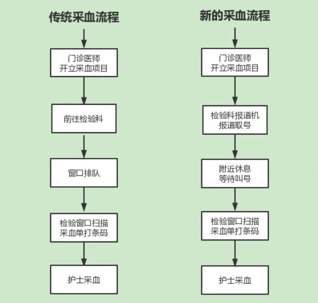 門診醫(yī)師開(kāi)采血項(xiàng)目>報(bào)道機(jī)報(bào)道取號(hào)>座位休息等待叫號(hào)機(jī)叫號(hào)>檢驗(yàn)窗口掃描采血單條碼>護(hù)士采血